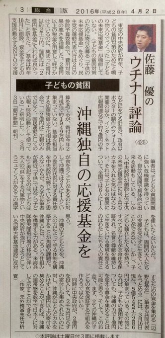 佐藤優のウチナー評論 子どもの貧困 沖縄独自の応援基金を 琉球新報 2016.4.2 Thanks to @GeorgeBowWow pic.twitter.com/NEHxvCUDFb