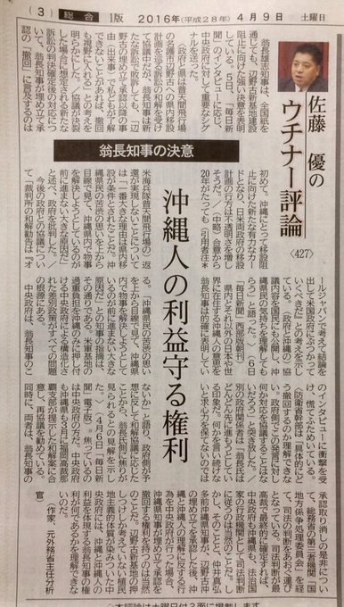 佐藤 優のウチナー評論 427 翁長知事の決意 沖縄人の利益守る権利 琉球新報 2016.4.9 Thanks to GeorgeBowWow pic.twitter.com/BnetsjM1t9